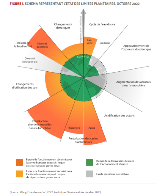 Neuf limites planétaires ont été définies par des chercheurs internationaux, conduits par le chercheur suédois Johan Rockström, du Stockholm resilience center. Si ces limites sont dépassées, le fonctionnement du « système Terre » est déstabilisé de manière irréversible (Figure 1). Ainsi, concernant la biodiversité, les auteurs affirment avec certitude que la Terre ne peut pas maintenir le rythme de perte actuel sans une dégradation significative de la résilience des écosystèmes compromettant in fine les activités et la vie humaines.