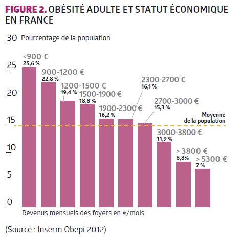 La prévalence du tabagisme et de l’obésité est plus élevée chez les populations plus pauvres (ORS et al., 2013). Les enfants sont plus sédentaires, passent beaucoup de temps devant la télé-vision, consomment moins de fruits et légumes et plus de boissons sucrées que les jeunes issus des milieux aisés. L’alimentation des populations défavorisées se caractérise par sa faible densité nutritionnelle et sa forte densité énergétique (Darmon, 2008).