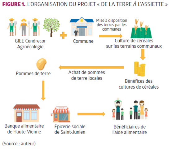 En 2015, une convention nationale est signée entre la Fédération française des banques alimentaires et l’Association des membres de l’ordre du mérite agricole. L’objectif de cette convention est de permettre la collecte de matières premières agricoles pour l’aide alimentaire. Un groupement d’agriculteurs situé dans le Limousin s’approprie la problématique et décide de développer un projet innovant. L’idée de ces agriculteurs : cultiver des terrains communaux abandonnés ou en attente de projet. Sur ces terrains, ils cultivent des céréales destinées à la vente, et avec les bénéfices de cette vente ils financent la mise en culture de produits frais locaux, pour les donner à la banque alimentaire [Figure 1].