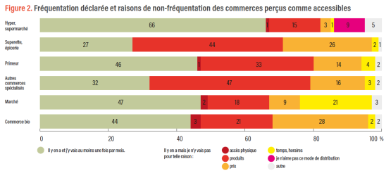 La proximité n’est pas le seul facteur qui influence la fréquentation des commerces alimentaires. Tous les ménages n’utilisent pas les commerces situés près de chez eux ou des lieux d’activités qu’ils fréquentent régulièrement. La fréquentation des commerces perçus comme accessibles par les ménages varie selon le type de magasins (Figure 2). Cette fréquentation est plus forte pour les hypermarchés et les super-marchés, suivis des primeurs, des marchés et des commerces bio. En revanche, moins d’un tiers des ménages a recours aux épiceries et aux commerces spécialisés auxquels ils déclarent avoir accès.