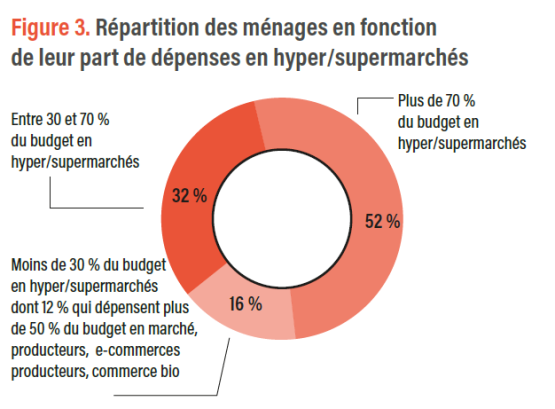 – Les grandes surfaces sont le lieu d’achat alimentaire dominant mais il est loin d’être exclusif. Près de la moitié des ménages réalisent au moins 30 % de leurs dépenses alimentaires dans d’autres types de commerces.