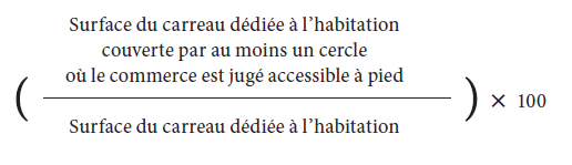 La zone d’étude a été divisée en carreaux de 200 m de côté pour chacun desquels l’Insee fournit les caractéristiques de la population. Des cercles de 300 m de rayon (à vol d’oiseau, soit un peu plus en empruntant les rues) ont été tracés autour de chaque commerce, correspondant à des espaces où le commerce est jugé accessible à pied (Carte 1). Sur cette base a été calculée, pour chaque carreau, la proportion de la population vivant à moins de 300 m de commerces vendant des fruits et légumes en appliquant la formule suivante :