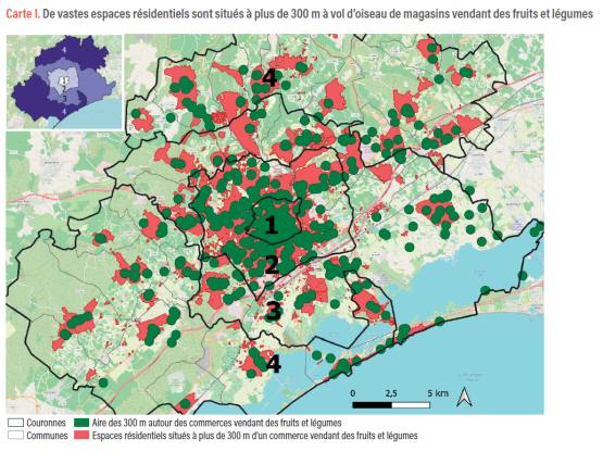 La cartographie réalisée permet de repérer des quartiers qui semblent, à première vue (compte tenue de la non-exhaustivité des bases de données utilisées), ne disposer d’aucun commerce vendant des fruits et légumes. Une telle identification permet également de calculer la part de la population résidente ayant accès à un tel commerce à proximité de son domicile, et d’analyser comment cette proportion varie selon la distance au centre-ville et le niveau de revenus du quartier.