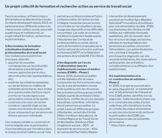 • Quotidienne, universelle et relationnelle, l’alimentation offre pourtant une opportunité de redonner du sens aux pratiques professionnelles et dépasser une logique d’assistance pour encourager le pouvoir d’agir collectif, renouant ainsi avec la mission émancipatrice du travail social.