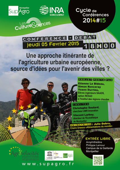 Dans le cadre du Cycle de conférences "Les Cultures sciences" organisées par Montpellier SupAgro et le centre INRA de Montpellier, Etienne Le Bideau, Simon Ronceray et Yoann Durrieu, trois étudiants porteurs du projet AgroVélocités ont partagé leurs connaissances et interrogations sur l’agriculture urbaine en Europe.